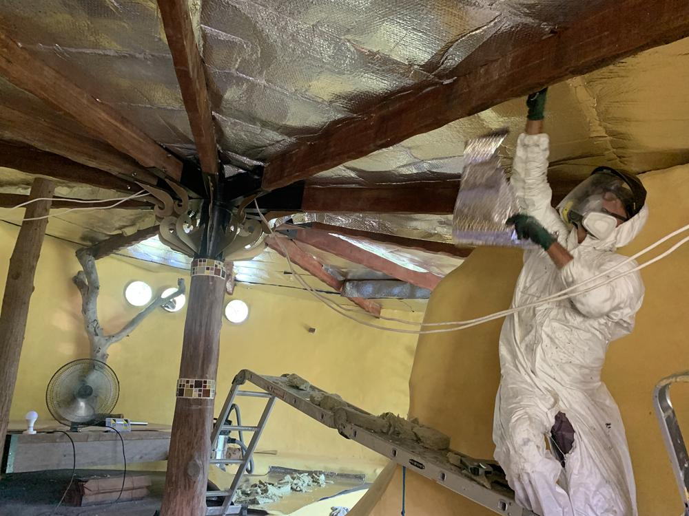 After fitting the AC we found that it was struggling a bit a midday as the roof panels, although insulated, we're still getting warm. We decided to go for more insulation with rock wool. Now came the messy job! If this was a normal roof/ceiling then the trusses would be spaced at 60cm and be the full length of the roof, but you already know what my roof looks like and the trusses are 40cm apart, bring it on!