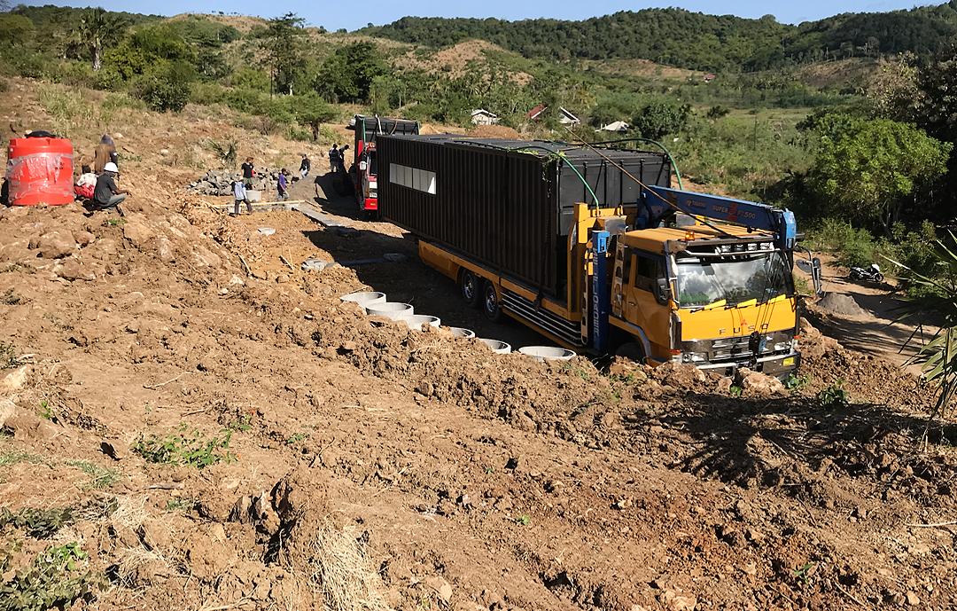 The truck with the 20' on it reversed into place so that its crane could be used to help lift the 40' and plonk it on its footings. Once the 40' was down, the 20' was plonked too, but at an angle so that the truck could turn around and come back in forward, it had to have the crane over the cab to be able to spin it too the correct angle. Shame that the truck got stuck on the uphill turn for nearly 24 hours and we had to wait until the next day for the spin and plonk.