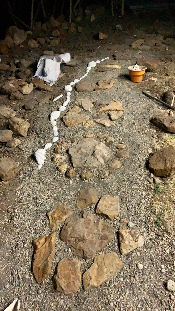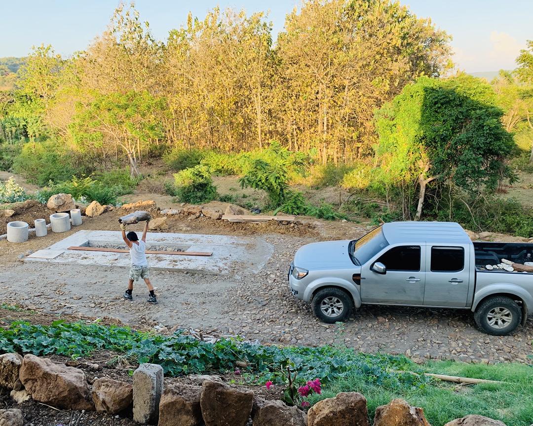 Rocks collected by hand around the plot, the local lads and us. The car park completely covered in two layers over two days! That's Ani carrying some drifwood :)