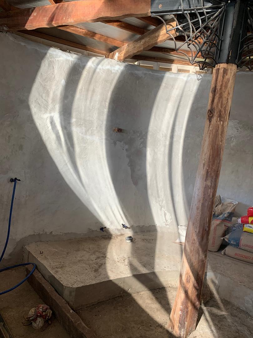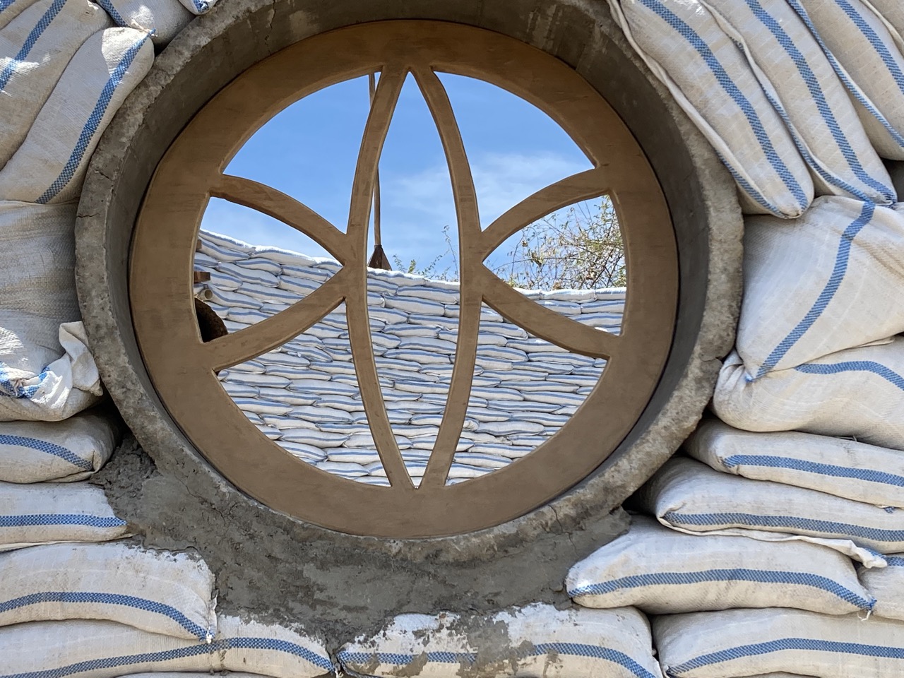 All the window openings are concrete rings of various sizes. Small ones at the back of the main room and the bathroom, mainly for ventilation and larger ones at the front for the light. All the rings are produced at 50cm deep, rather handy and more luck than judgement they are the same depth as the walls. The largest size are used for the water wells around Indonesia, but because they are used horizontally in a well they are not weight bearing radially and the structure is a lot thinner than all the others. We noticed cracks appearing in it just as we finished the whole height of the wall above it. Now that it's been there a while you can see that it would have held OK because of the keystone arch above it, but in panic mode at the time I put a tire in to help support it while I quickly made the window frame! The frame was made from some high quality plywood, two sheets glued and screwed together to make a 1 1/2" frame, quite cool even if I say so myself. Finished with polycarbonate windows drilled and screwed to the frame on both sides, this gives an insulating air gap like double glazing.