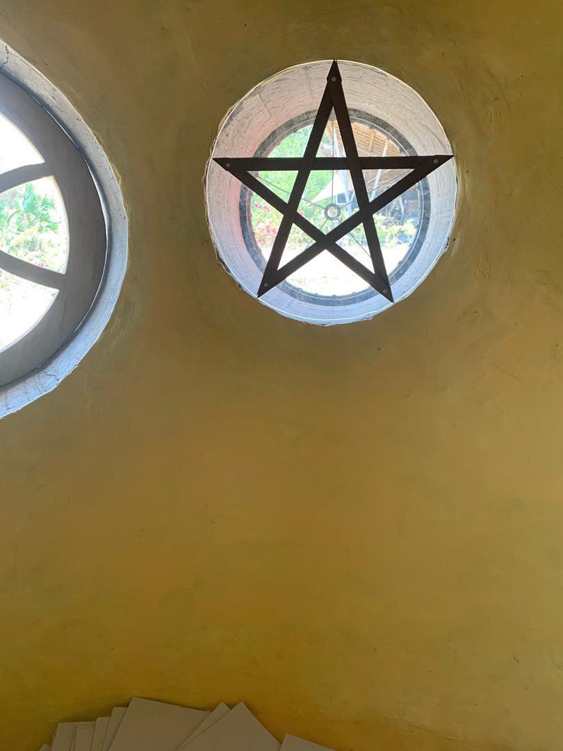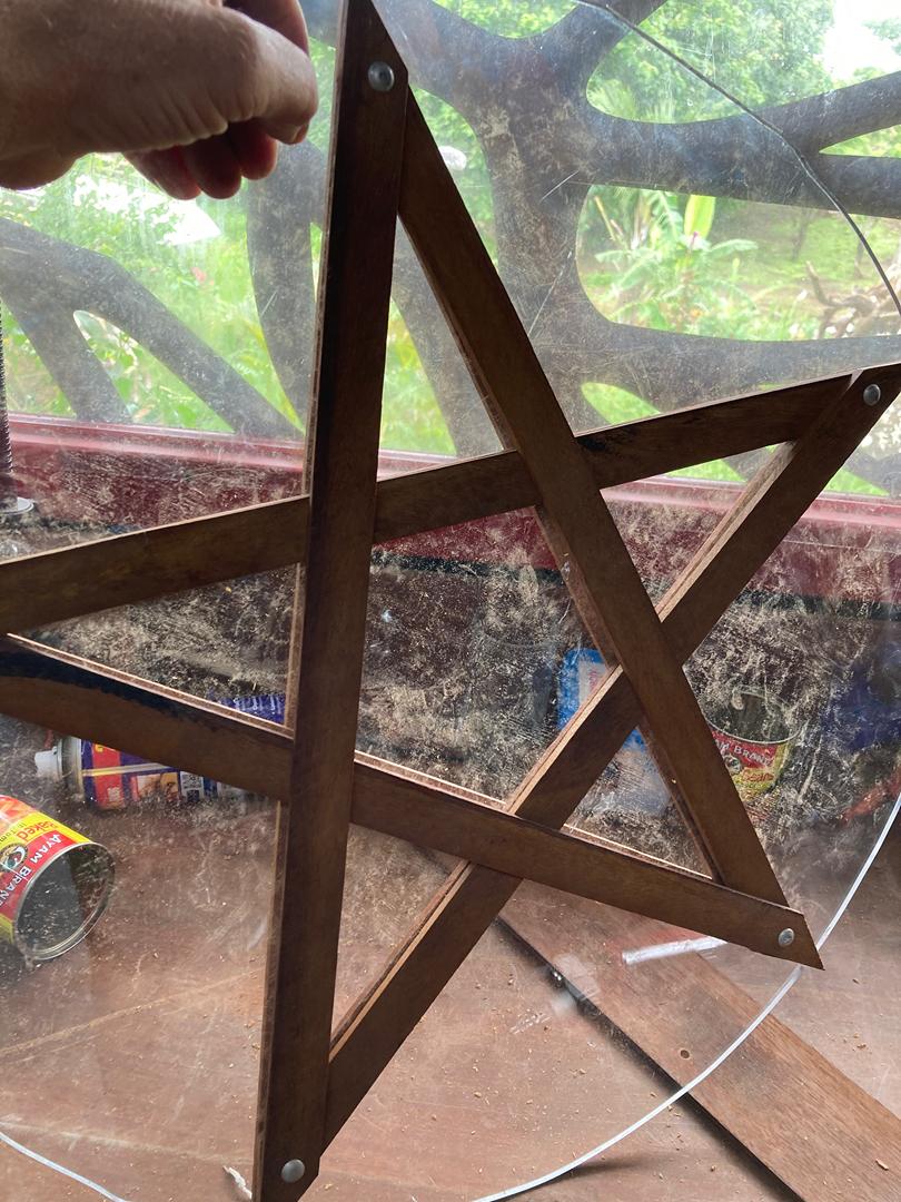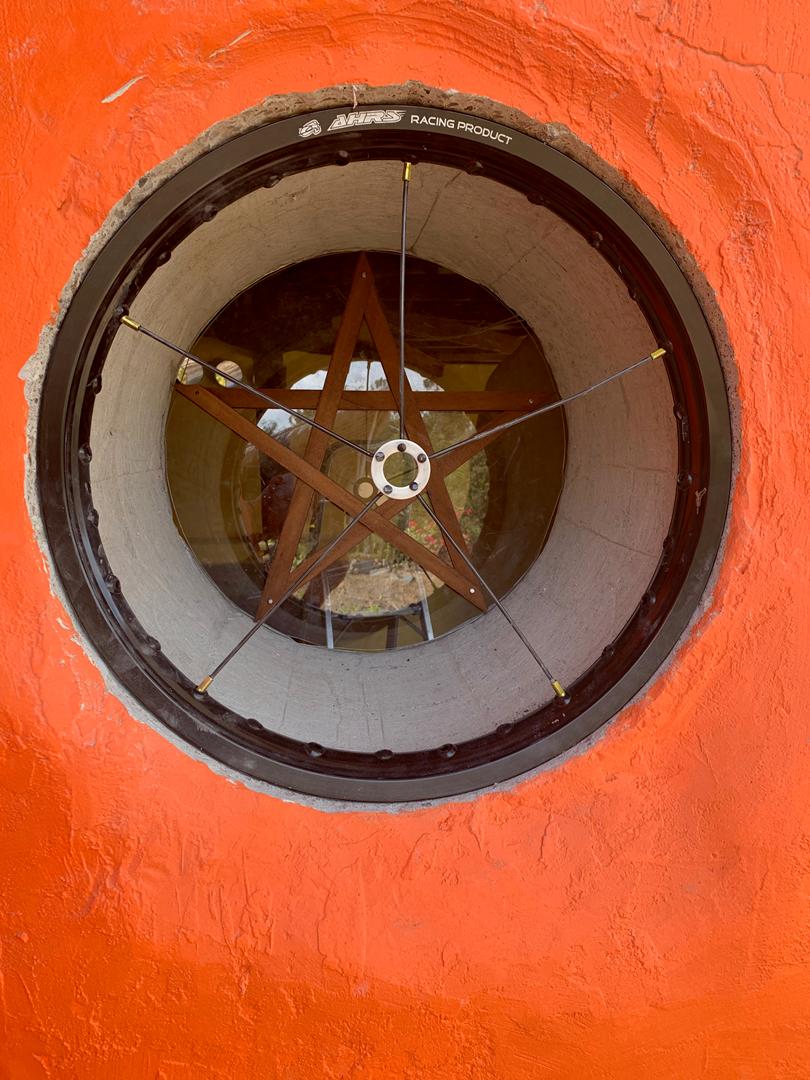 The other two widows at the front are made from 5mm polycarbonate sheets, double glazed again, with a pentagram of thin iron wood strips on the inside one riveted through polycarbonate helicopter stylee :) For the frame I used motorcycle wheel rims and a few spokes through a washer in the middle, the two windows are bolted together though the centre washer.