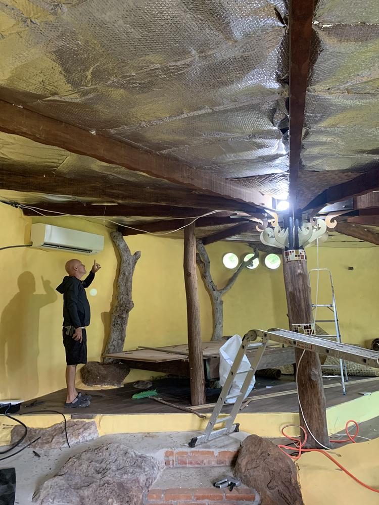 The next phase took a month, each and every truss measured and the trimming wood cut to length, the ends that butted up to the long side pieces were chaffered to look nicer and all the pieces sanded and oiled …….. 120 pieces in total. Then we sourced pandan leaf mats from the village, everyone that made them sold us all they had but we still had to get more made, lots of waiting time for new ones to arrive but many side projects got started and some even finished. All the locals use the mats for sitting and sleeping on in their homes, insulation from the concrete floor I presume, they don't use mattresses and seem to be fine and comfy with a millimetre of panda leaf padding.