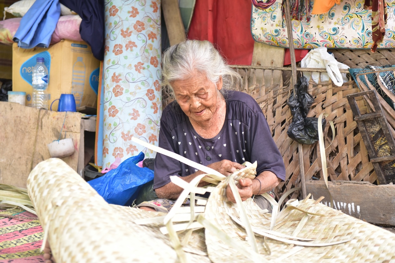 Doncel's Mum making the pandan mats on her terrace, yup that's her house, she was actually given a very pretty bamboo house recently by an NGO, moved into it and a week later moved back to her old place :)