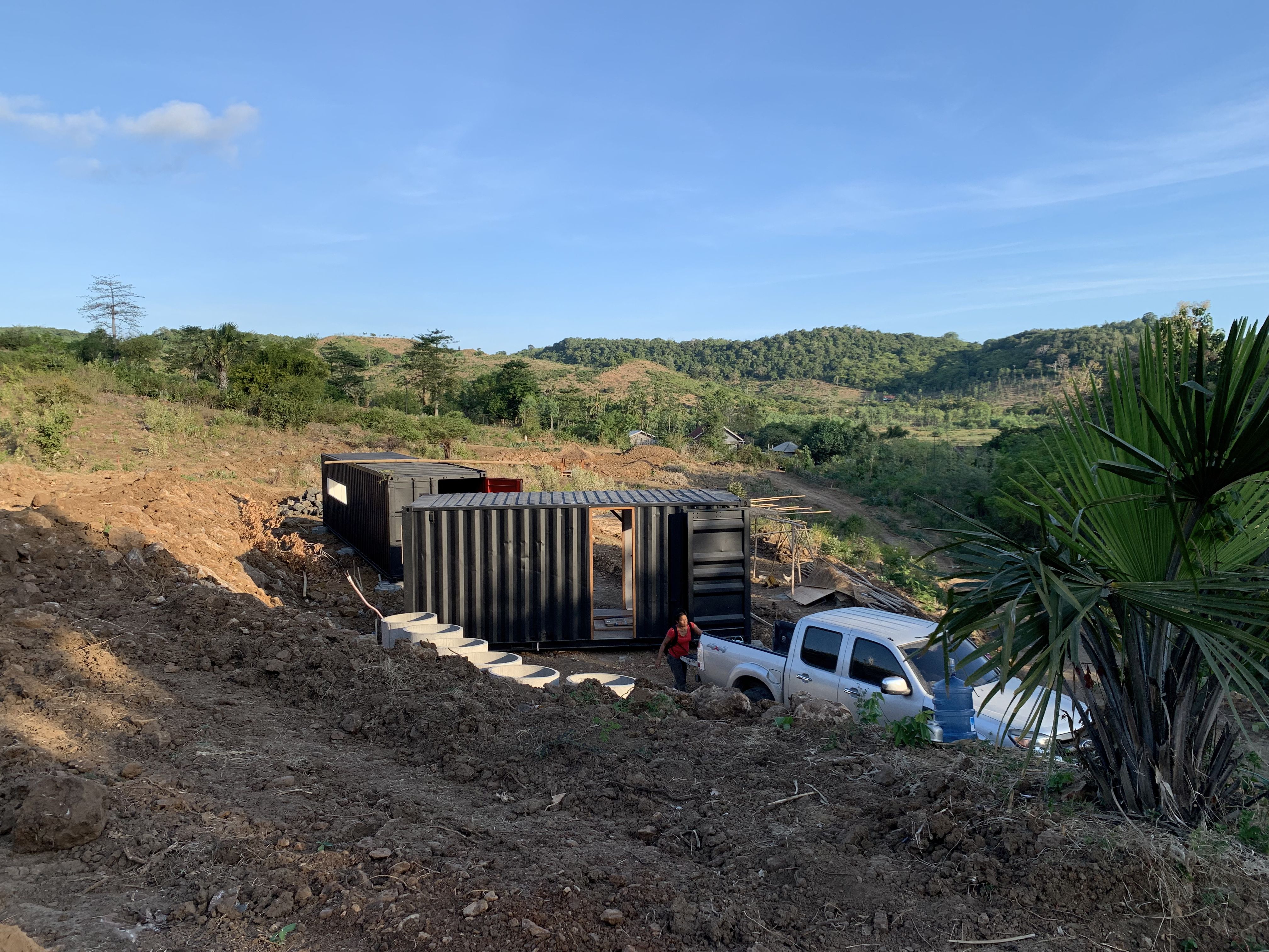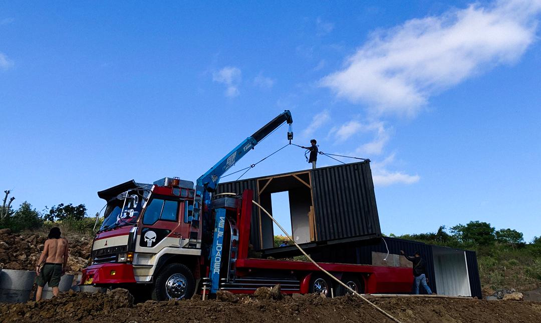The truck with the 20' on it reversed into place so that its crane could be used to help lift the 40' and plonk it on its footings. Once the 40' was down, the 20' was plonked too, but at an angle so that the truck could turn around and come back in forward, it had to have the crane over the cab to be able to spin it too the correct angle. Shame that the truck got stuck on the uphill turn for nearly 24 hours and we had to wait until the next day for the spin and plonk.