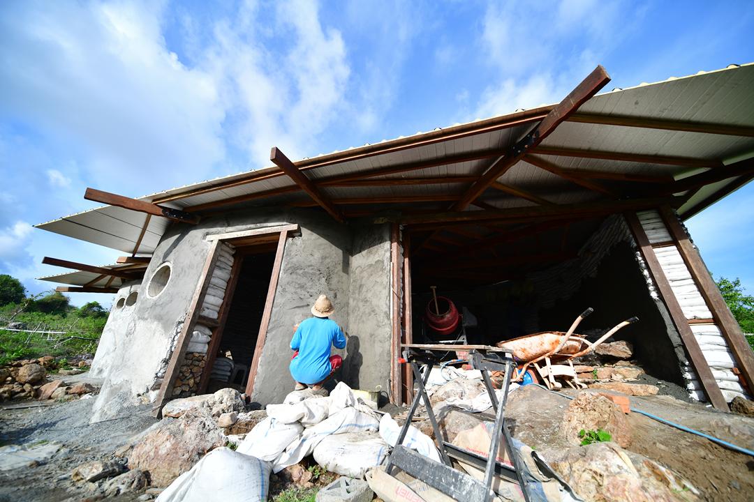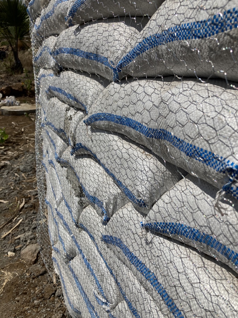 All the walls are first covered in chicken wire, held on by simple wire 'U' clips just pushed into the bags.