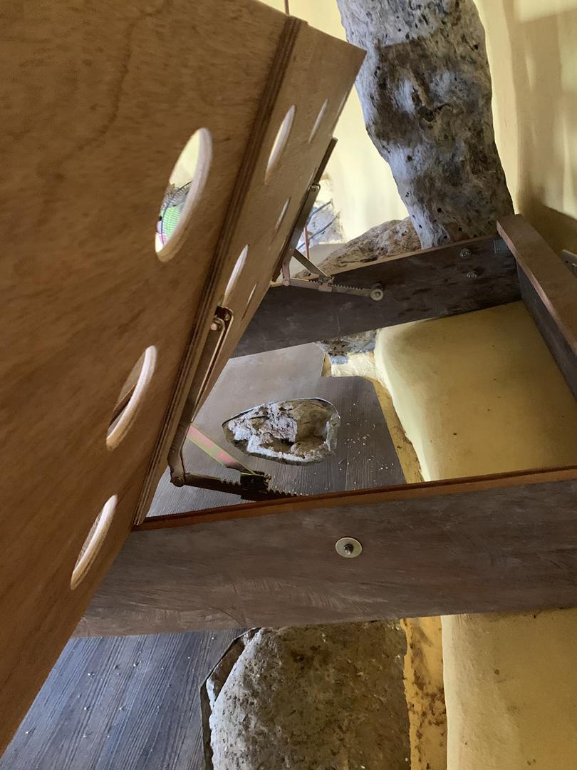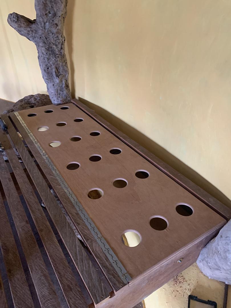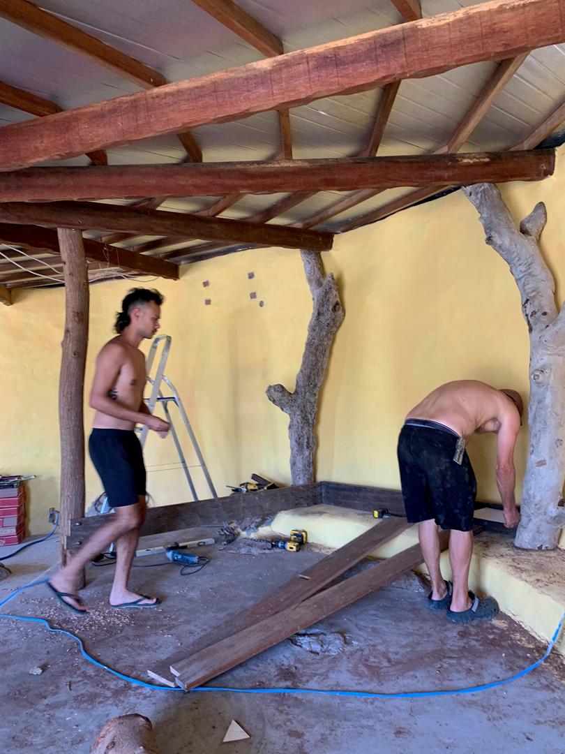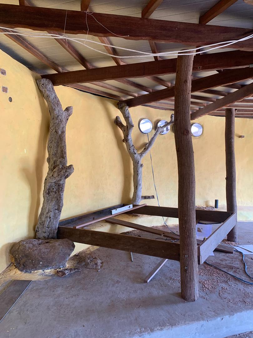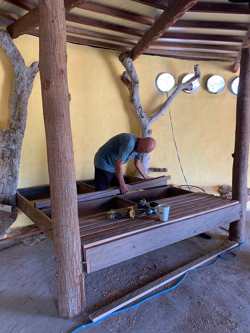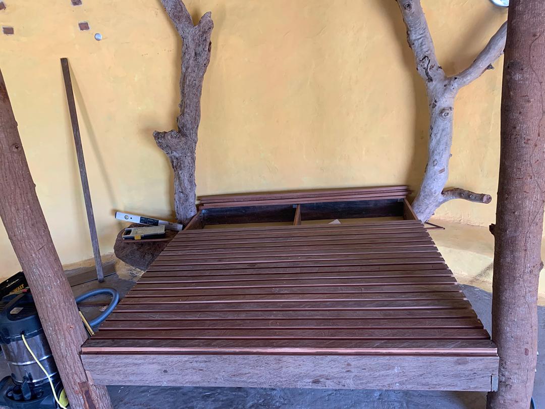 'The Bed' another chapter deliberated over at many 2am design sessions! A four poster from tree trunks, the head resting on the raised 'seating' that we'd integrated into the walls. One morning I called the owner of the teak plantation in front of us to ask him if I could cut some of the smaller trunks and use them, he said yes and that same morning I cut two and dragged them up to the house with my ATV. That afternoon we were on a beach combing trip and found two washed up mangrove trees and two mahogany tree trunks recently cut for a shelter but not used, we asked the locals there and they said take them. If you've ever seen an old mangrove tree washed up on the beach you'll know what an awesome piece of wood looks like and how f'ing hard and heavy it is! So we had the posts and some hardwood that we'd bought previously for the kitchen floor, that didn't work out and we cut the planks to size for the bed.